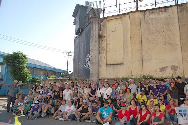 Como segundo momento, se dio paso a la lectura y reproducción de testimonios de hermanos privados de libertad, un momento que permitió acercarse a su realidad, sus emociones, dolores y esperanzas. Luego, el obispo bendijo recipientes con agua que luego fueron utilizados para el acto central de la actividad, el abrazo a la cárcel.